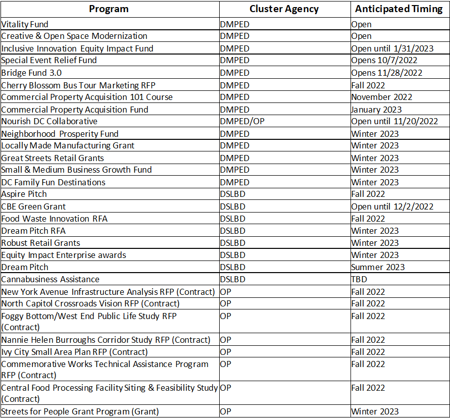 Various existing and new grant programs and procurement opportunities for DC businesses will be available through the DMPED cluster in fiscal year 2023. See below for the calendar and program descriptions. Program details and updates will be added here as they become available.